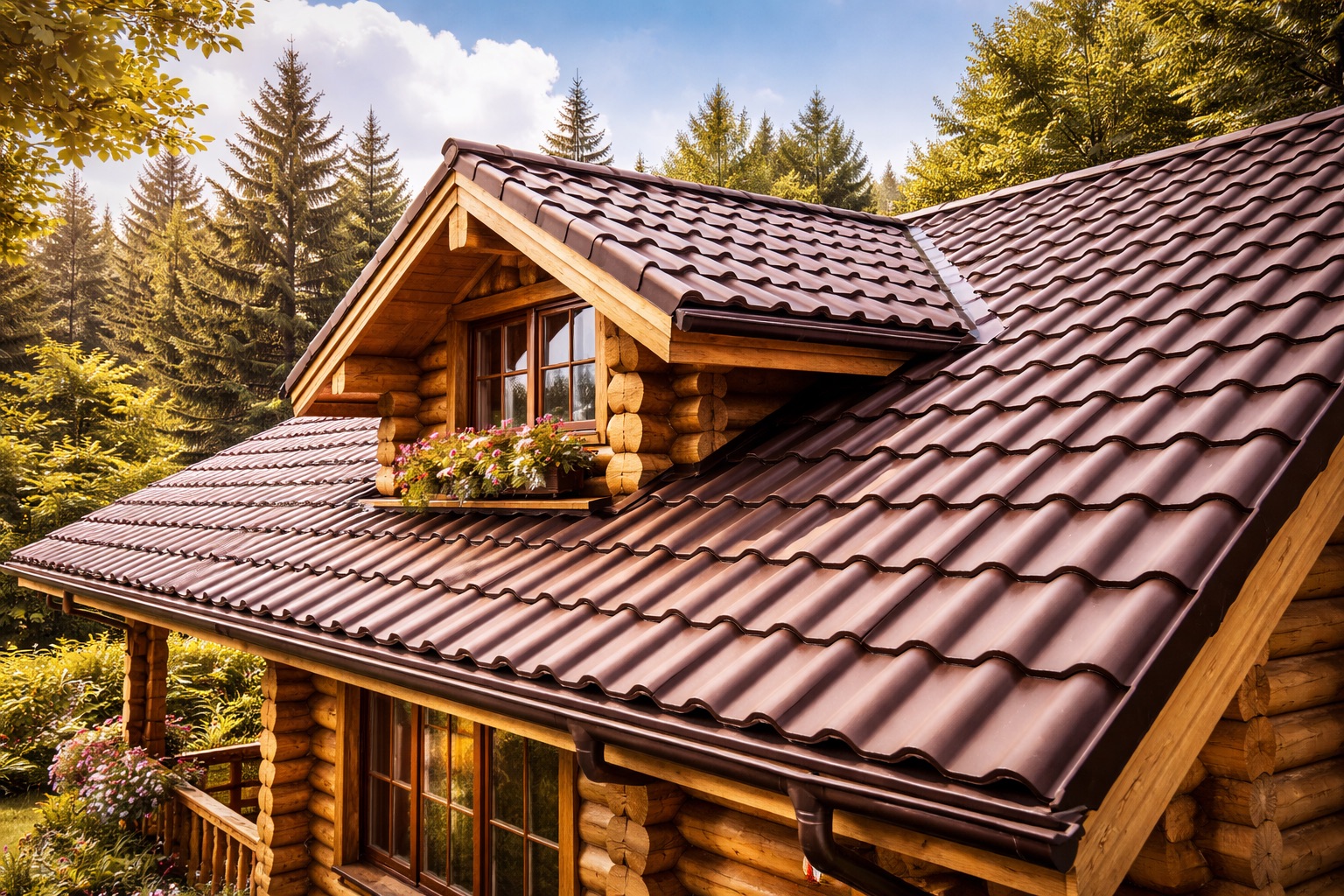Крыша должна соответствовать стилю дома. Для классического бревенчатого дома чаще выбирают металлочерепицу тёплых оттенков или мягкую кровлю в природной гамме. Для более современного проекта подойдёт фальцевая кровля с лаконичной геометрией.